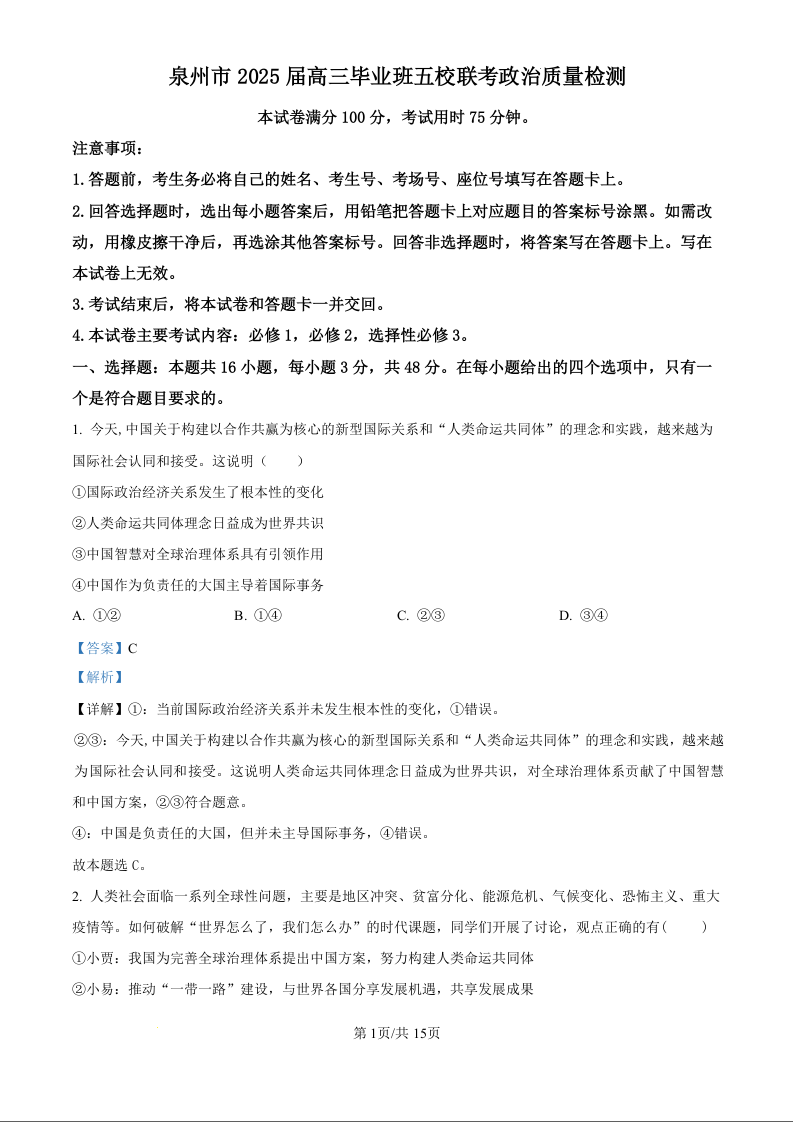 泉州市2025届高三毕业班五校联考+政治答案