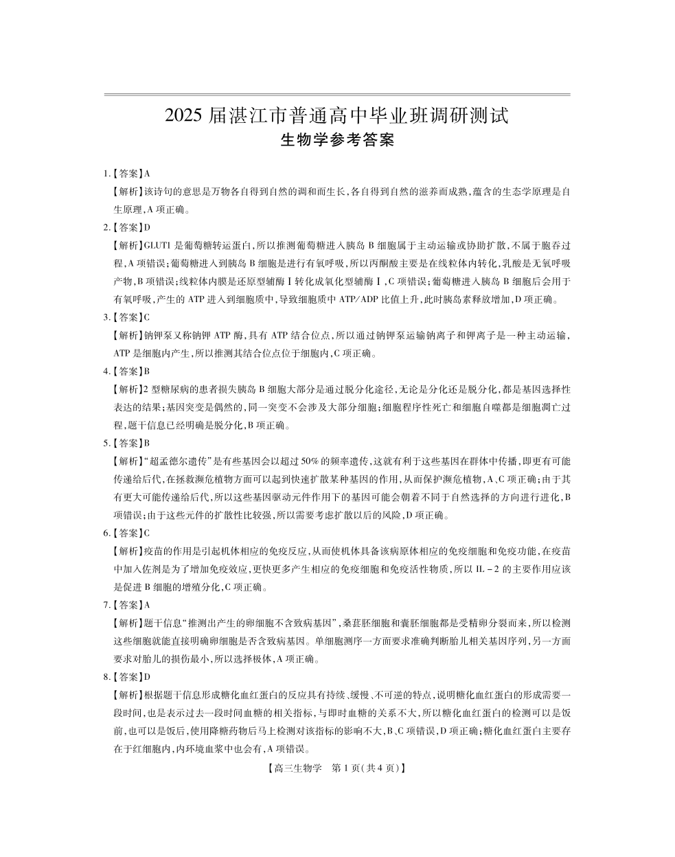 2025届湛江市普通高中毕业班10月调研测试+生物答案