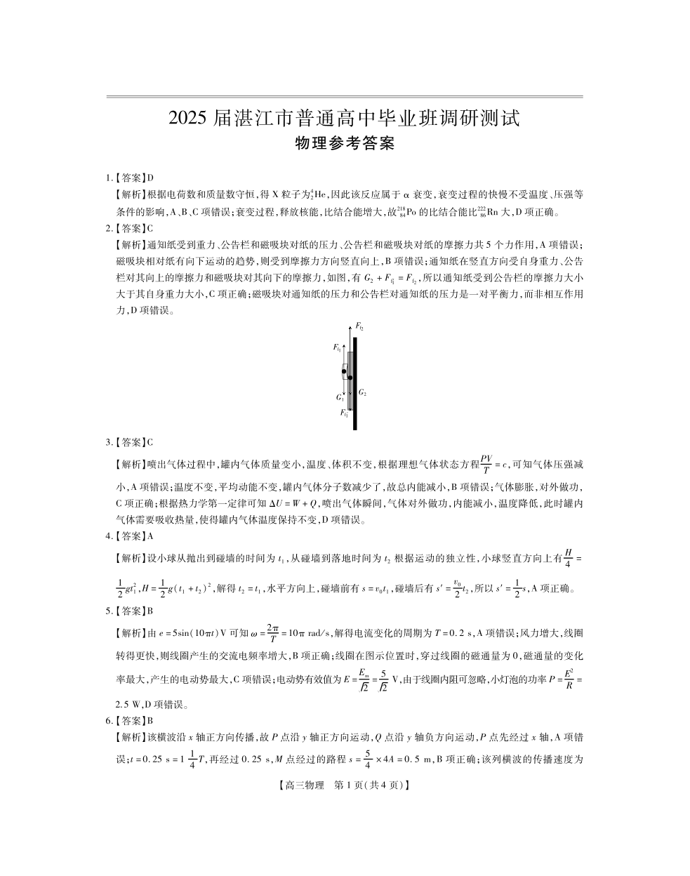 2025届湛江市普通高中毕业班10月调研测试+物理答案
