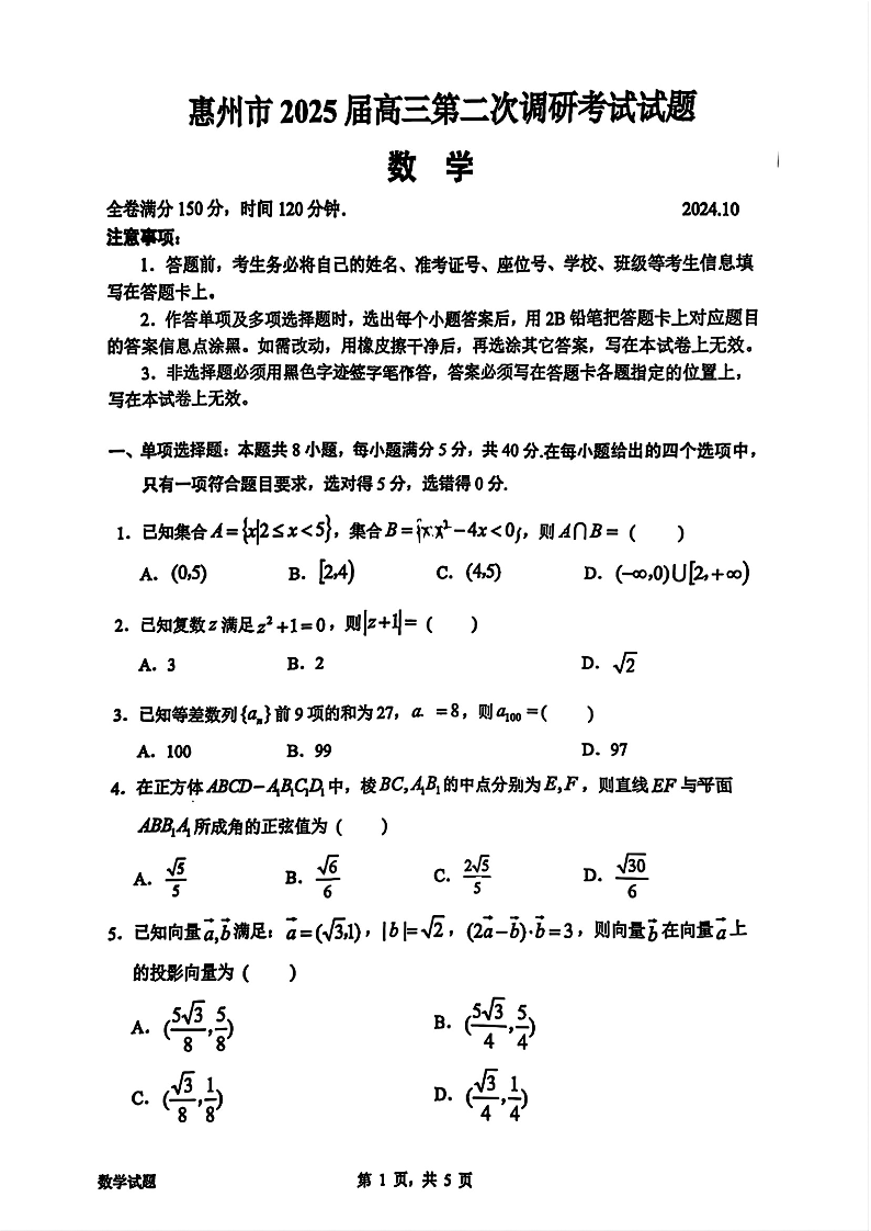 广东省惠州市2025届高三第二次调研考试(惠州二调)数学