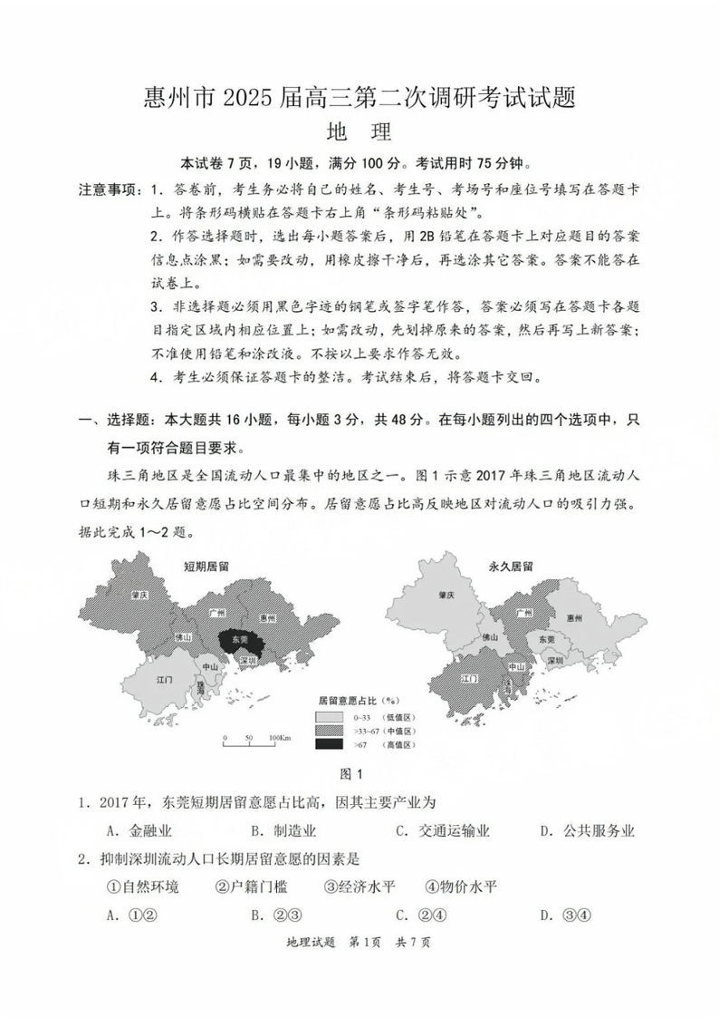 广东省惠州市2025届高三第二次调研考试(惠州二调)地理
