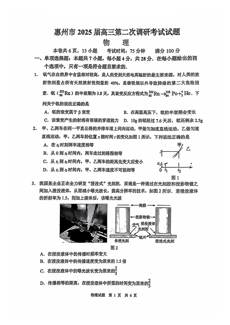 广东省惠州市2025届高三第二次调研考试(惠州二调)物理