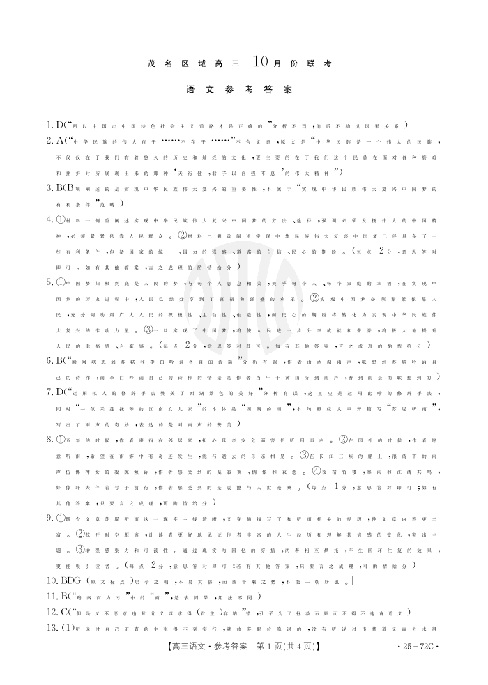广东省茂名市2025届高三10月联考+语文答案