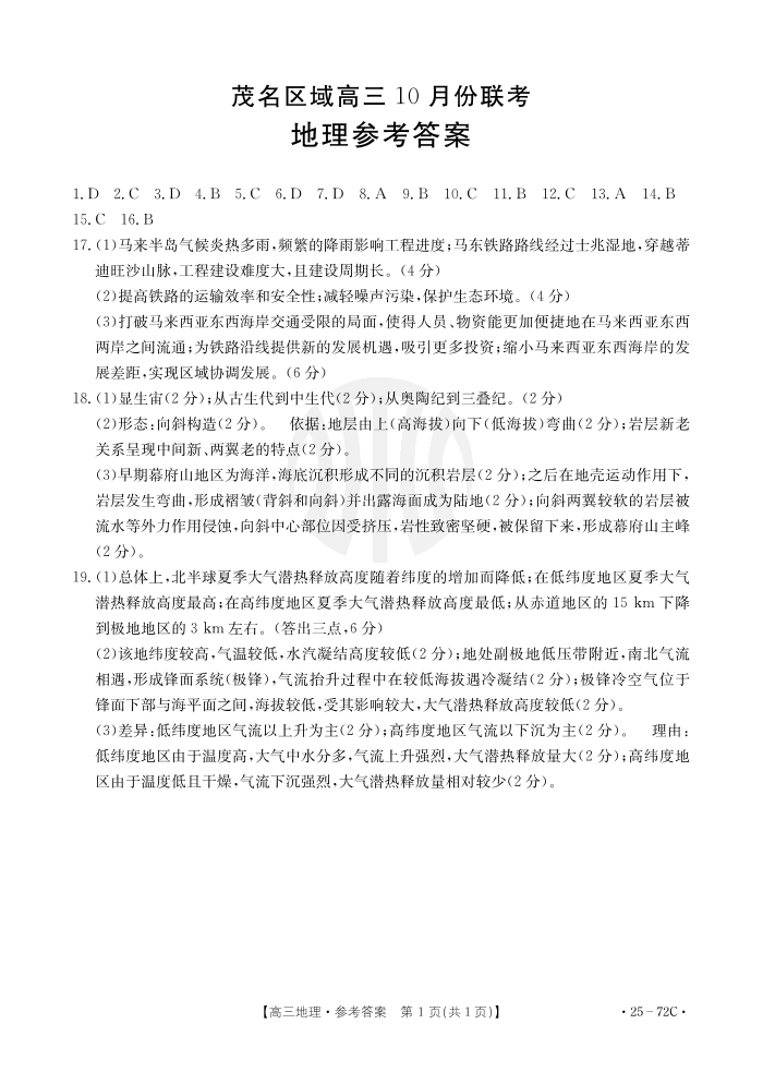 广东省茂名市2025届高三10月联考+地理答案