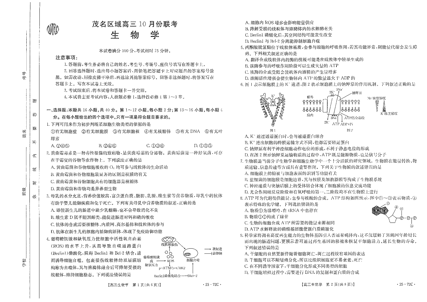 广东省茂名市2025届高三10月联考+生物