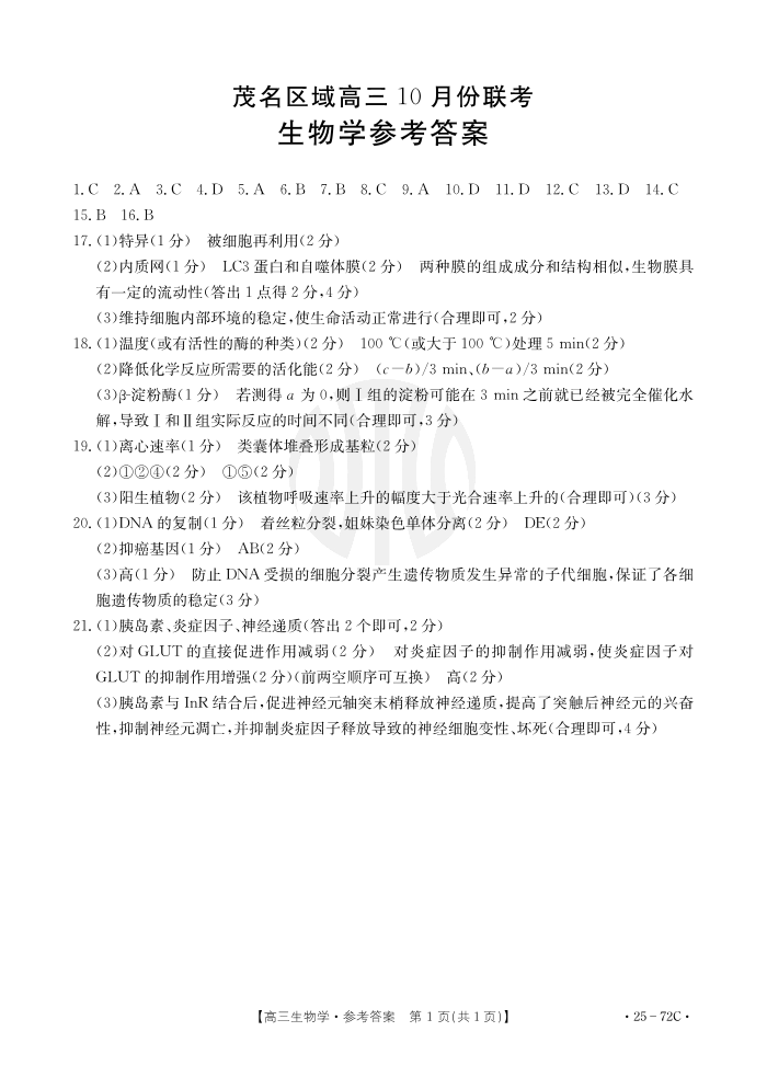广东省茂名市2025届高三10月联考+生物答案