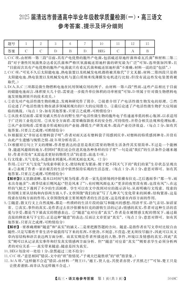 广东省清远市2024-2025学年高三上学期第一次模拟考试+语文答案
