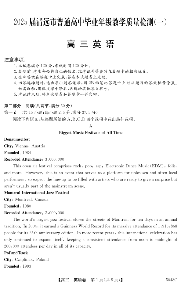 广东省清远市2024-2025学年高三上学期第一次模拟考试+英语