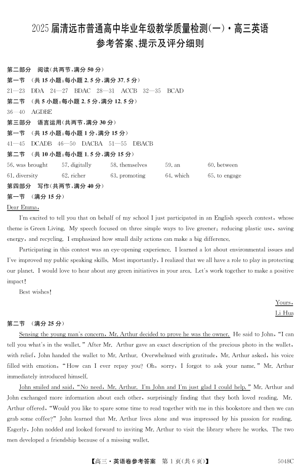 广东省清远市2024-2025学年高三上学期第一次模拟考试+英语答案