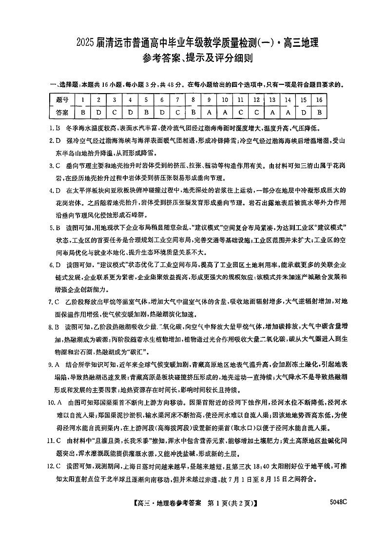广东省清远市2024-2025学年高三上学期第一次模拟考试+地理答案