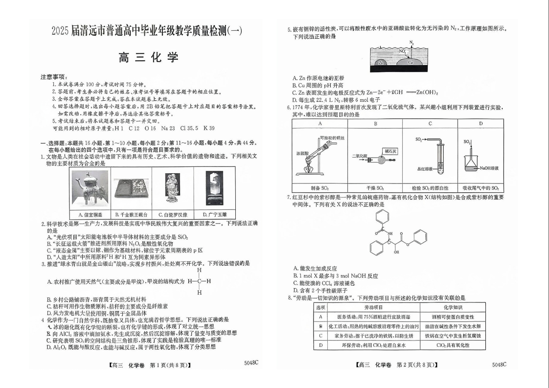 广东省清远市2024-2025学年高三上学期第一次模拟考试+化学
