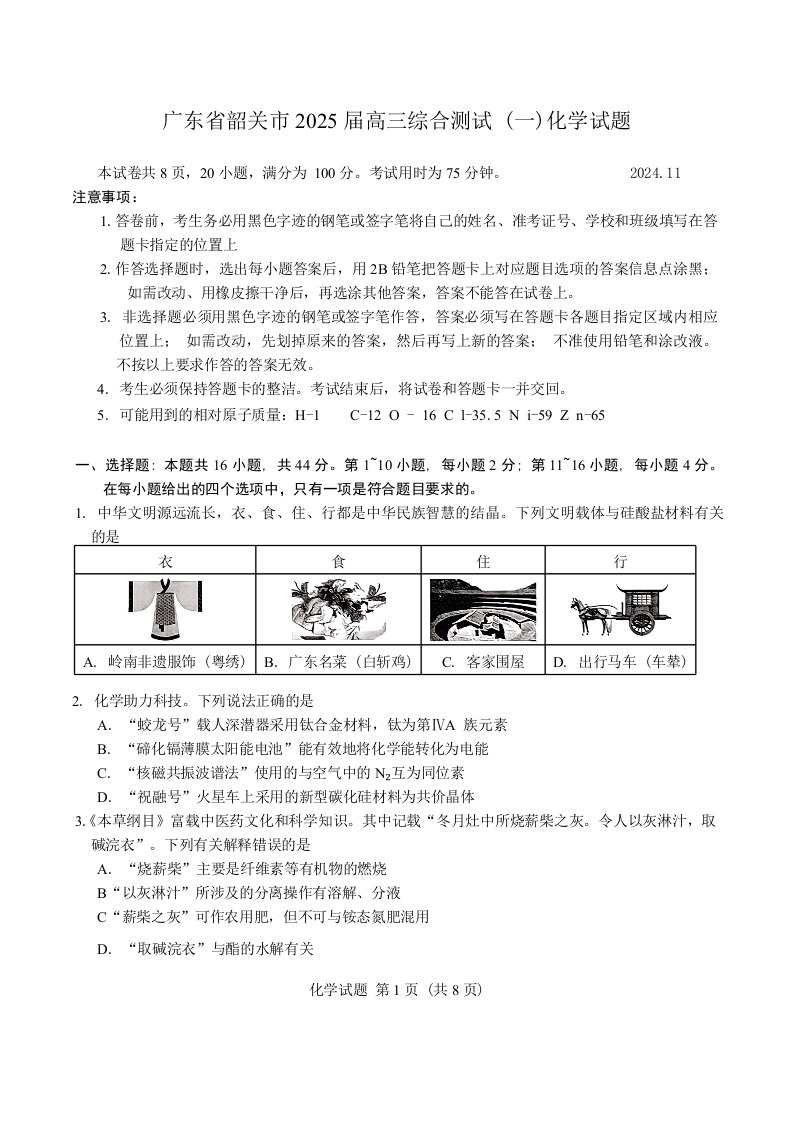 广东省韶关市2025届高三综合测试(一)化学
