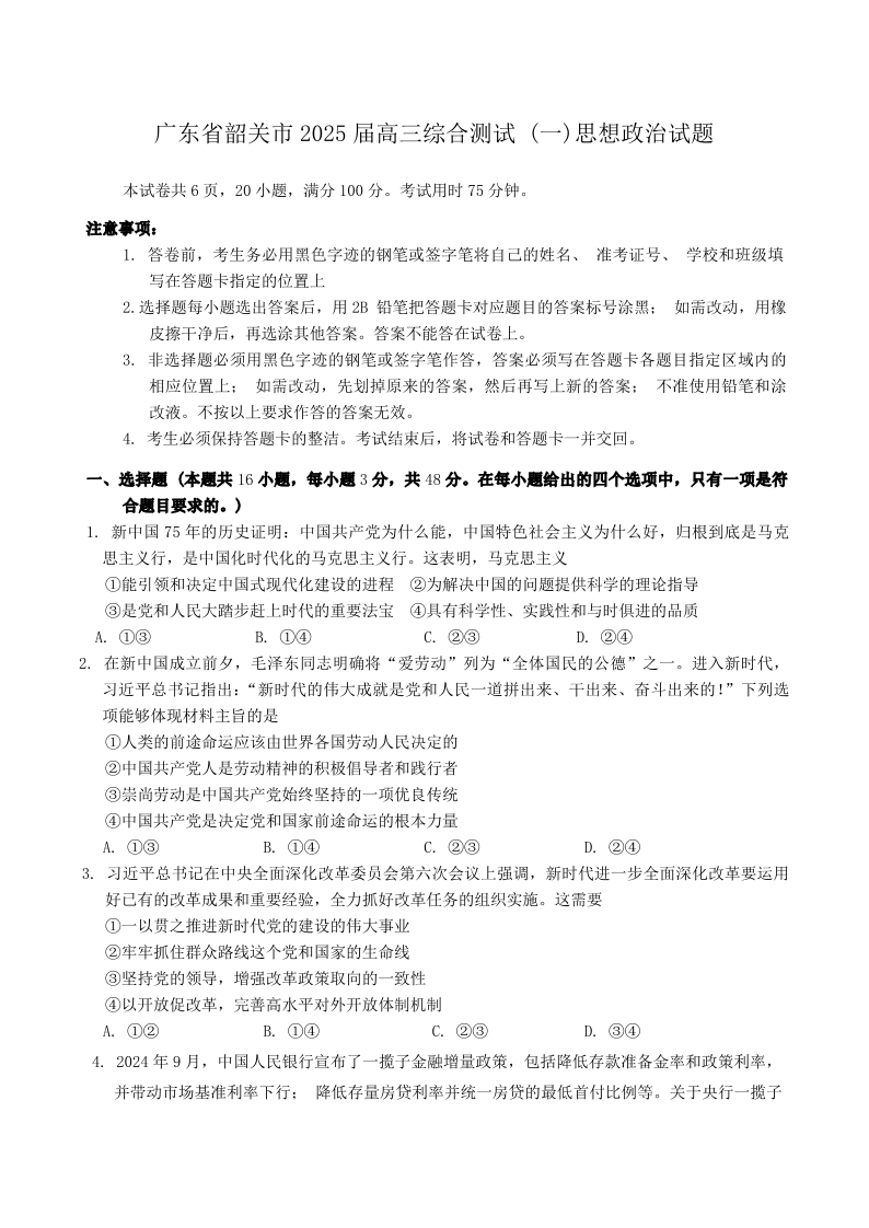 广东省韶关市2025届高三综合测试(一)政治