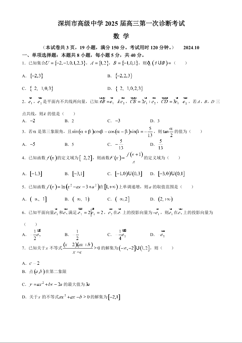 深圳市高级中学(集团)2025届高三第一次诊断考试+数学