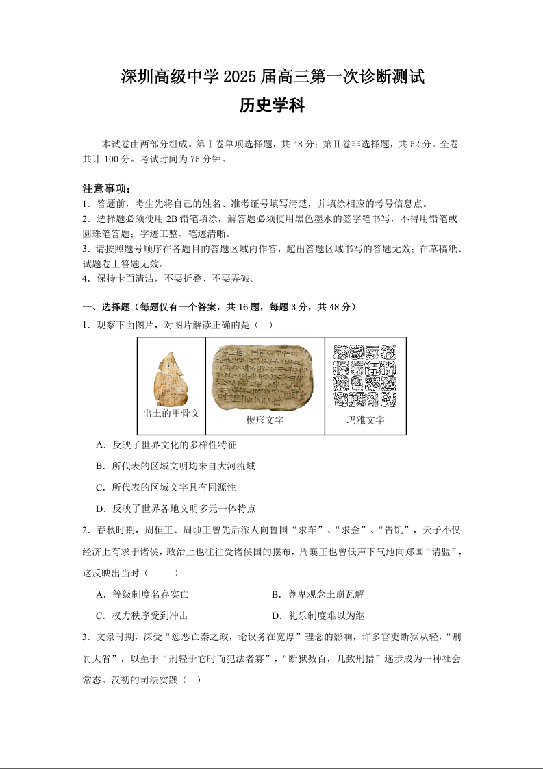 深圳市高级中学(集团)2025届高三第一次诊断考试+历史