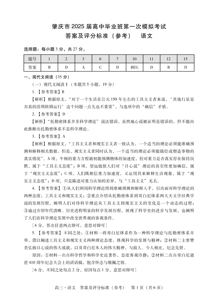 肇庆2025届高三一模·语文答案