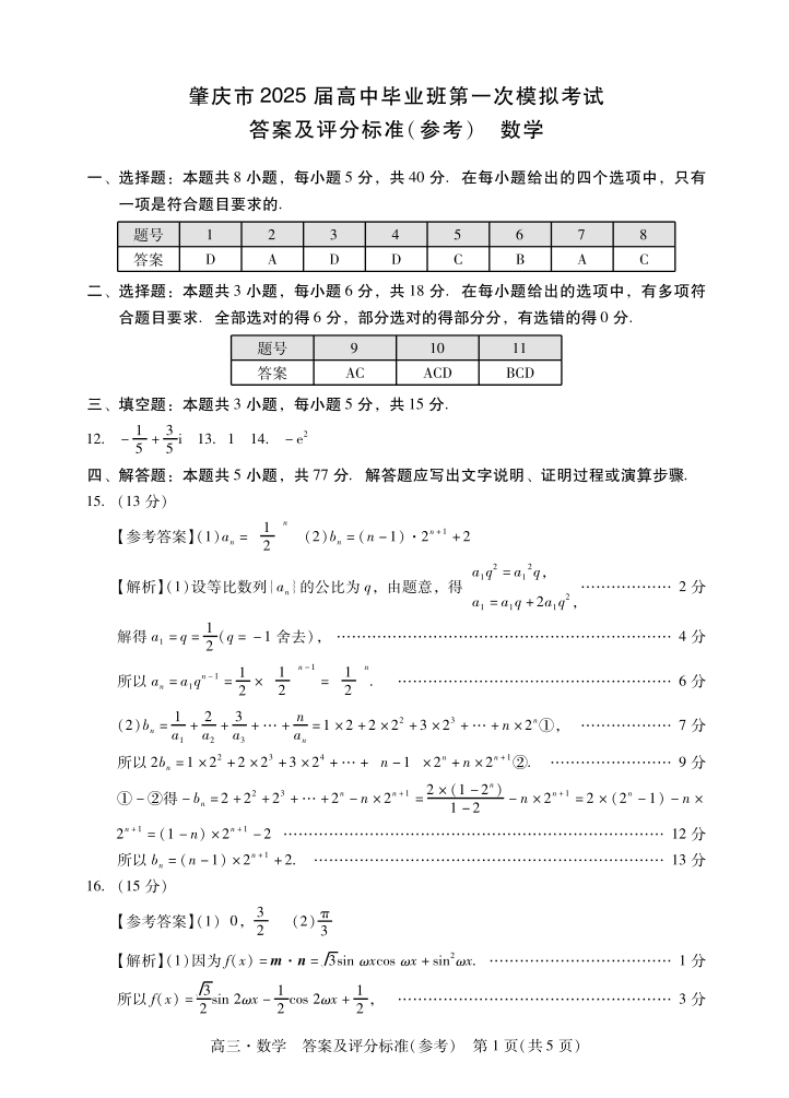 肇庆2025届高三一模·数学答案