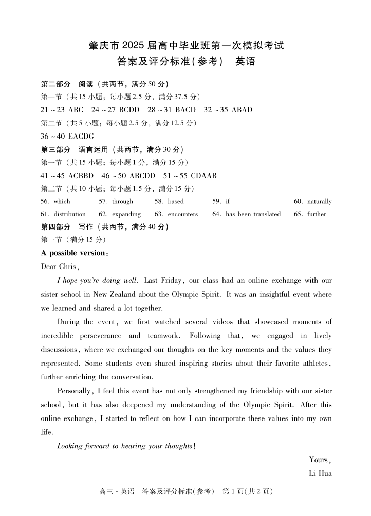 肇庆2025届高三一模·英语答案