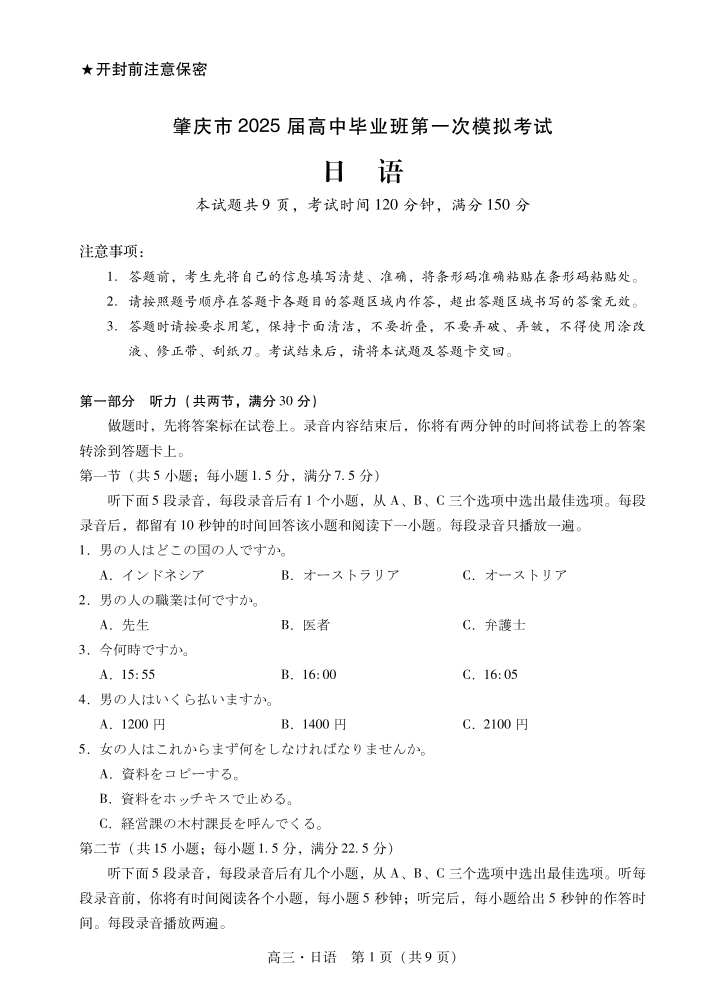 肇庆2025届高三一模·日语