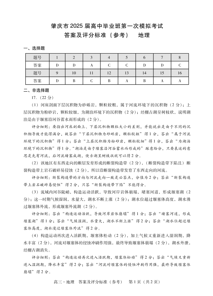 肇庆2025届高三一模·地理答案