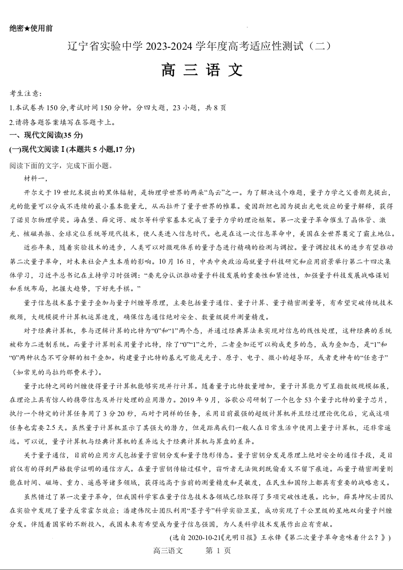 辽宁省实验中学2023-2024学年度高考适应性测试(二)语文