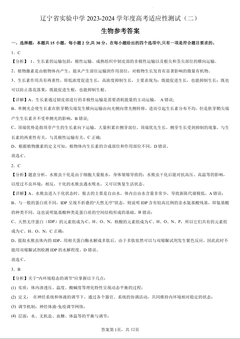 辽宁省实验中学2023-2024学年度高考适应性测试(二)生物参考答案