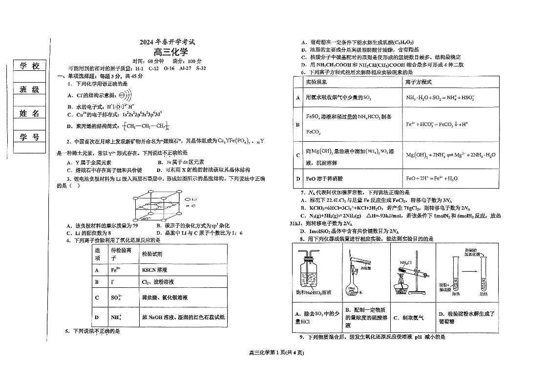 辽宁省辽东南协作体2023-2024学年高三下学期开学考试 化学