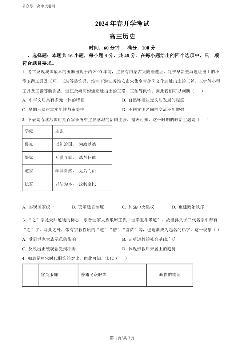 辽宁省辽东南协作体2023-2024学年高三下学期开学考试 历史