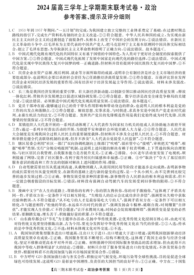 辽宁省朝阳市建平县2023-2024学年高三上学期期末联考 政治答案