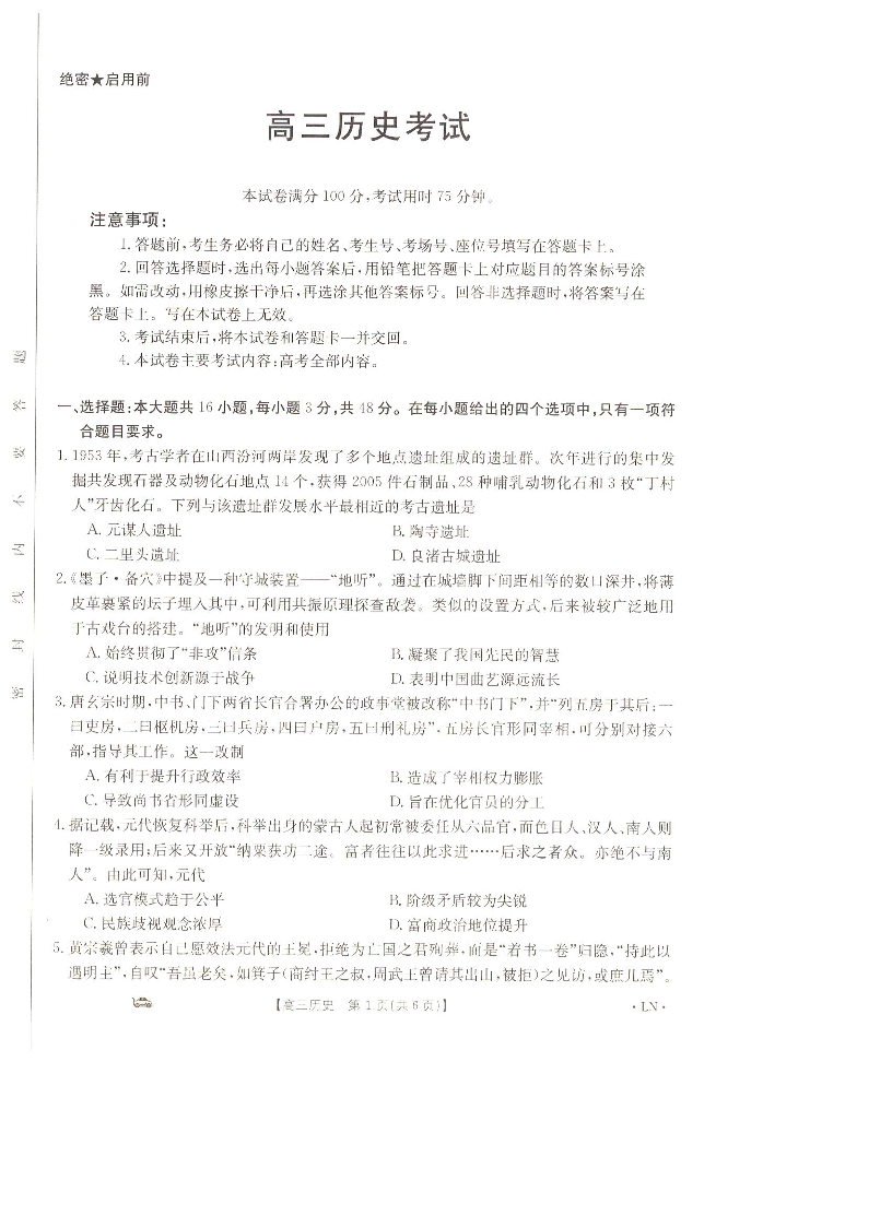 辽宁省抚顺市六校协作体2023-2024学年高三上学期期末考试 历史