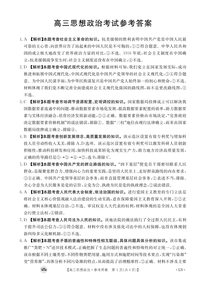 辽宁省抚顺市六校协作体2023-2024学年高三上学期期末考试 政治答案