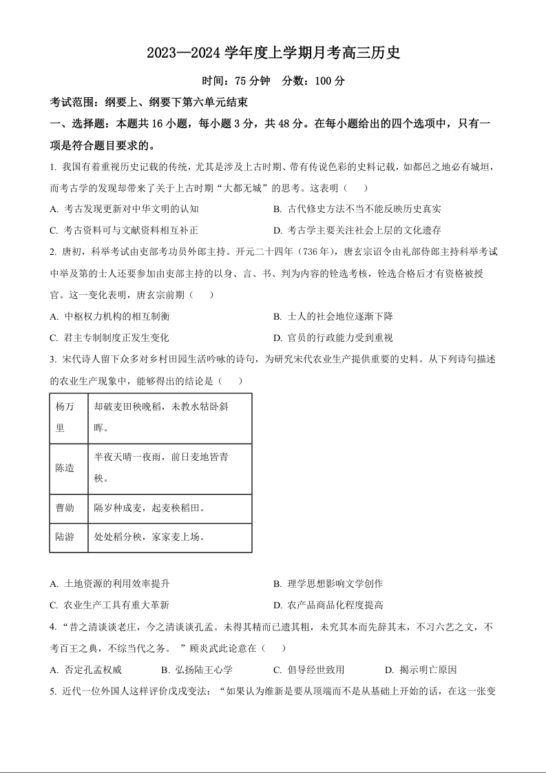 辽宁省辽东南协作校2023-2024学年高三上学期12月月考试题 历史