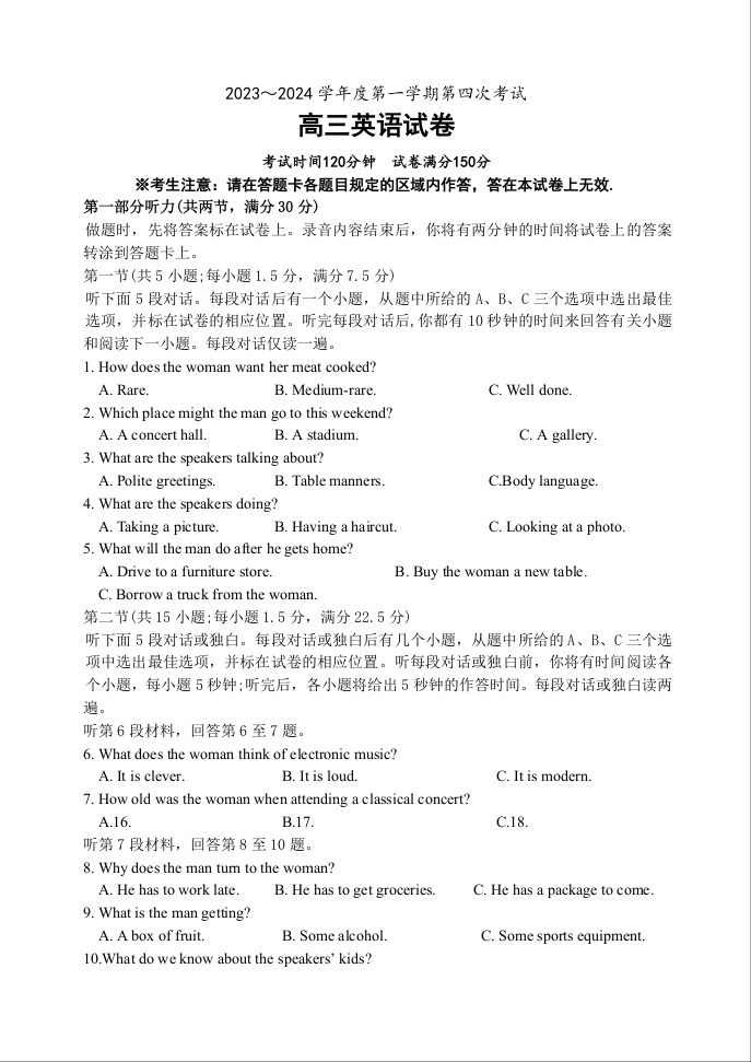 辽宁省北镇市第二高级中学、第三高级中学2023-2024学年高三上学期第四次月考试题 英语