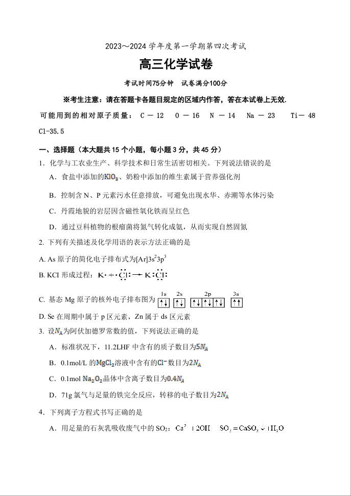 辽宁省北镇市第二高级中学、第三高级中学2023-2024学年高三上学期第四次月考试题 化学