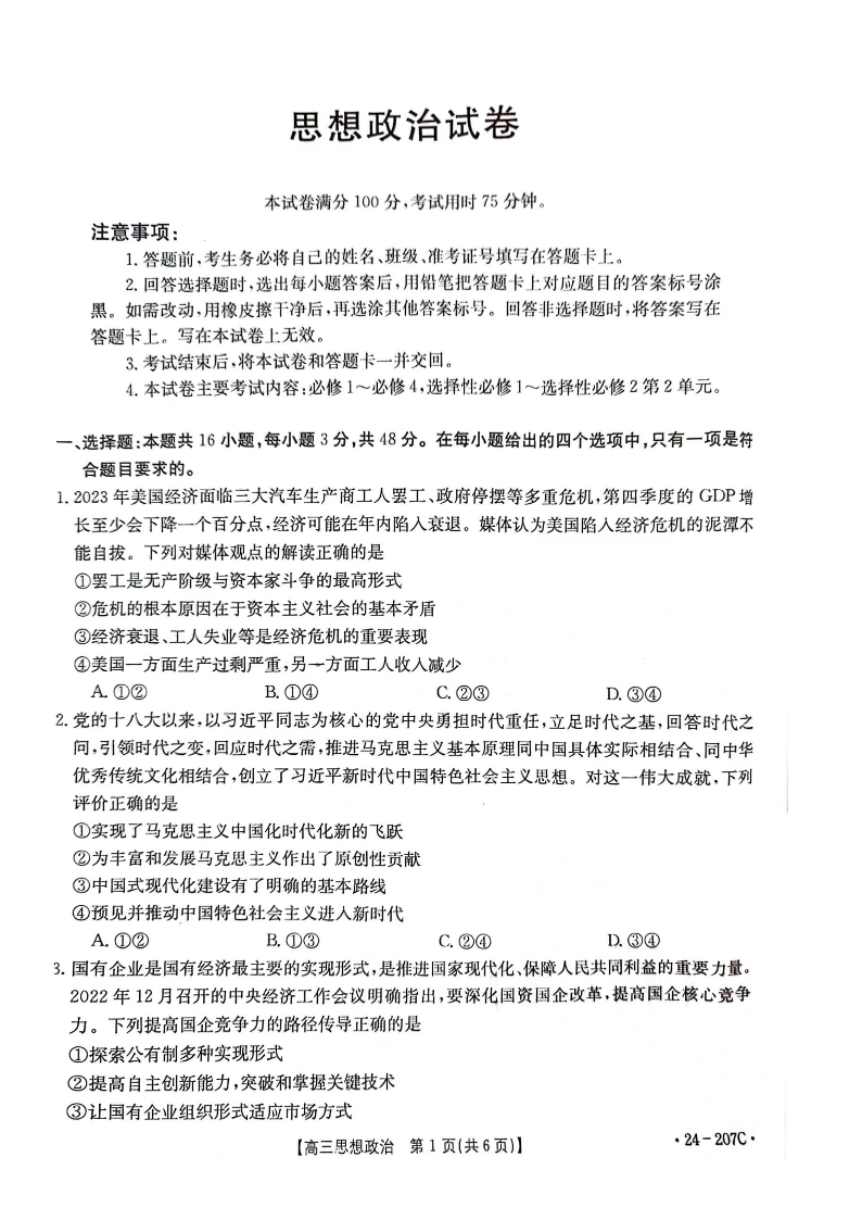 辽宁省部分学校2023-2024学年高三上学期12月考试 政治