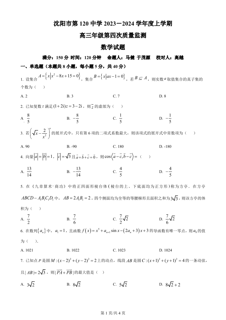 辽宁省沈阳市第一二〇中学2023-2024学年高三上学期第四次质量监测 数学