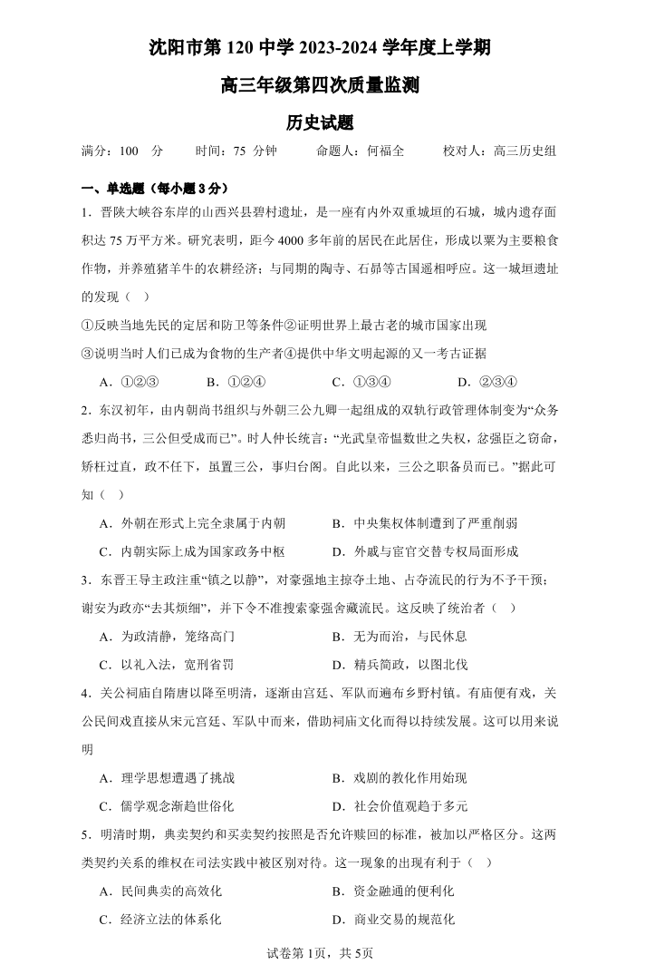辽宁省沈阳市第一二〇中学2023-2024学年高三上学期第四次质量监测 历史