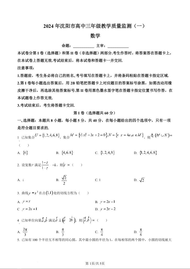 辽宁省沈阳市2023-2024学年高三上学期教学质量监测(一)数学