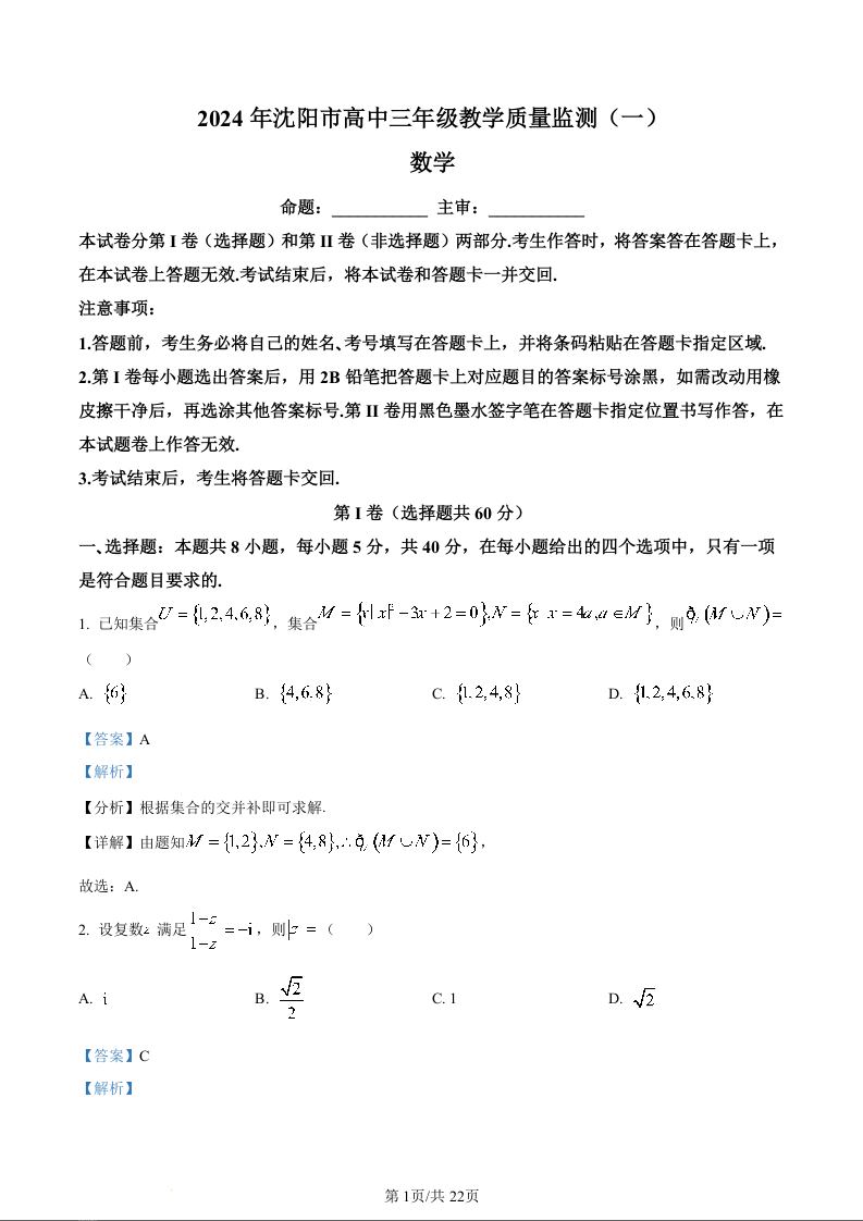 辽宁省沈阳市2023-2024学年高三上学期教学质量监测(一)数学答案