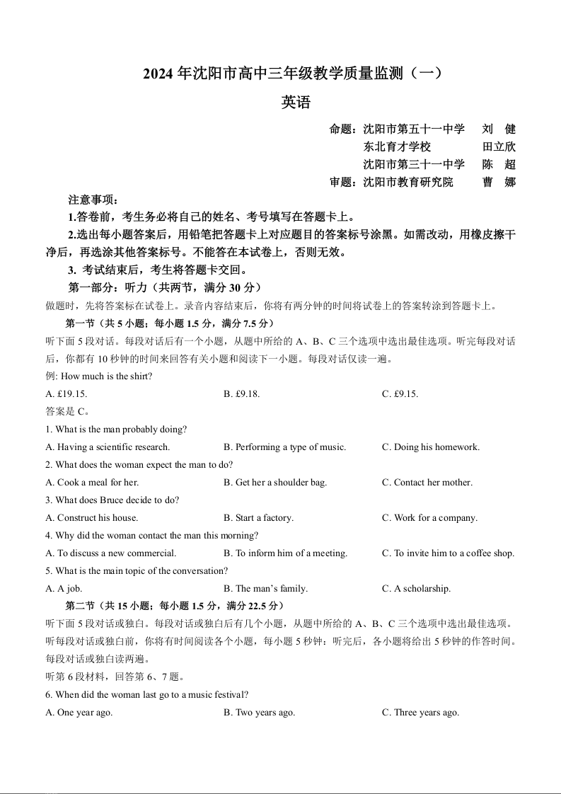 辽宁省沈阳市2023-2024学年高三上学期教学质量监测(一)英语