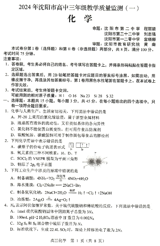 辽宁省沈阳市2023-2024学年高三上学期教学质量监测(一)化学