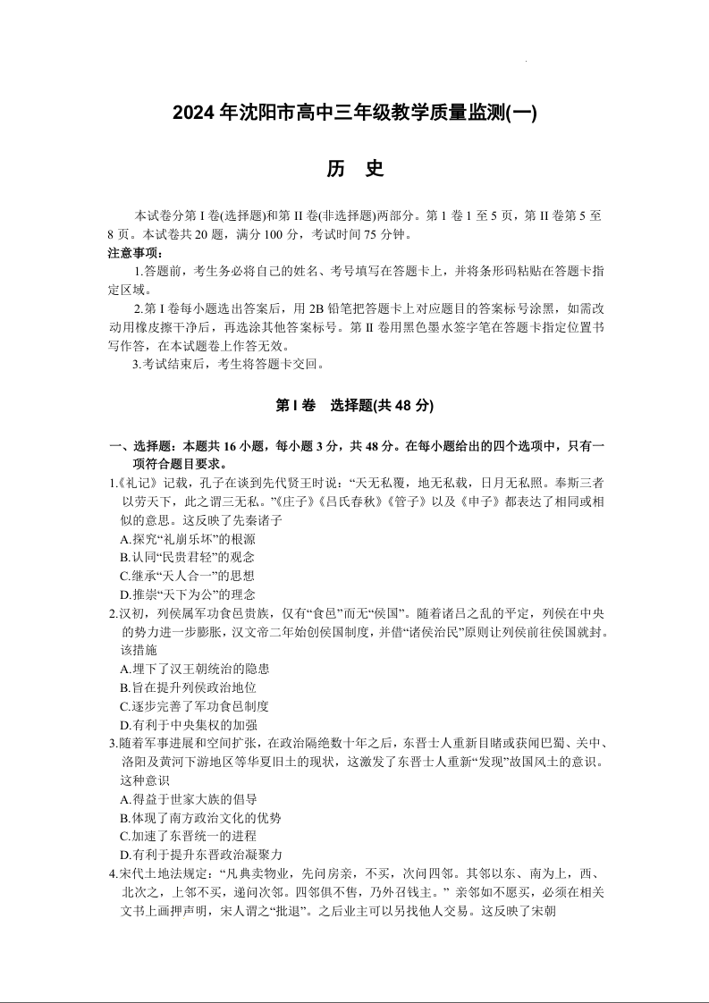 辽宁省沈阳市2023-2024学年高三上学期教学质量监测(一)历史