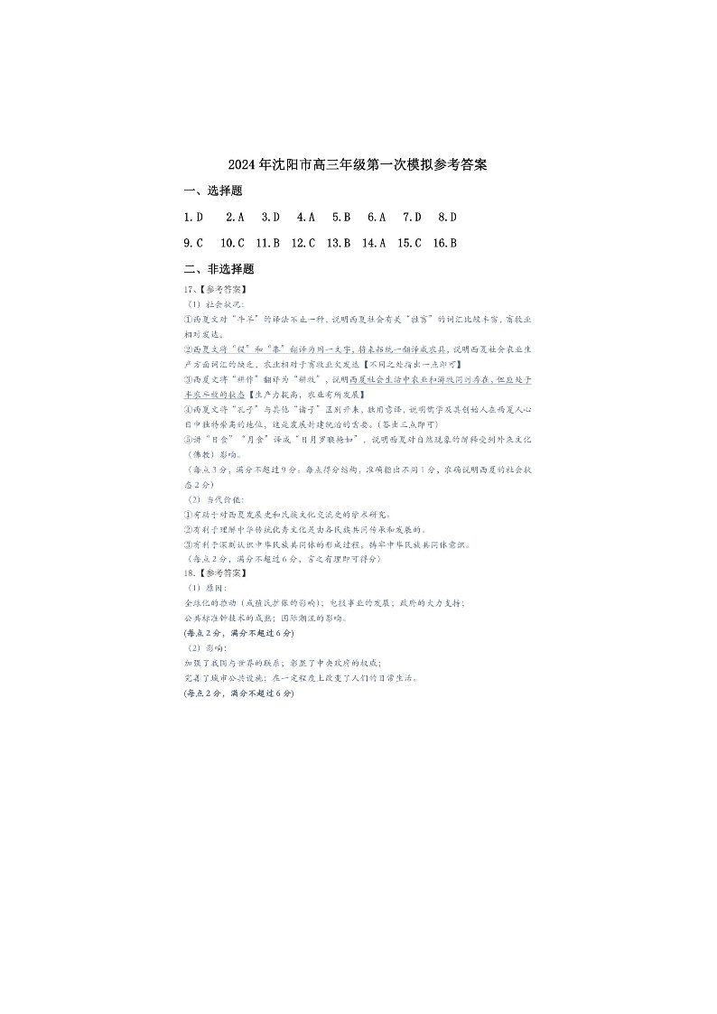 辽宁省沈阳市2023-2024学年高三上学期教学质量监测(一)历史答案
