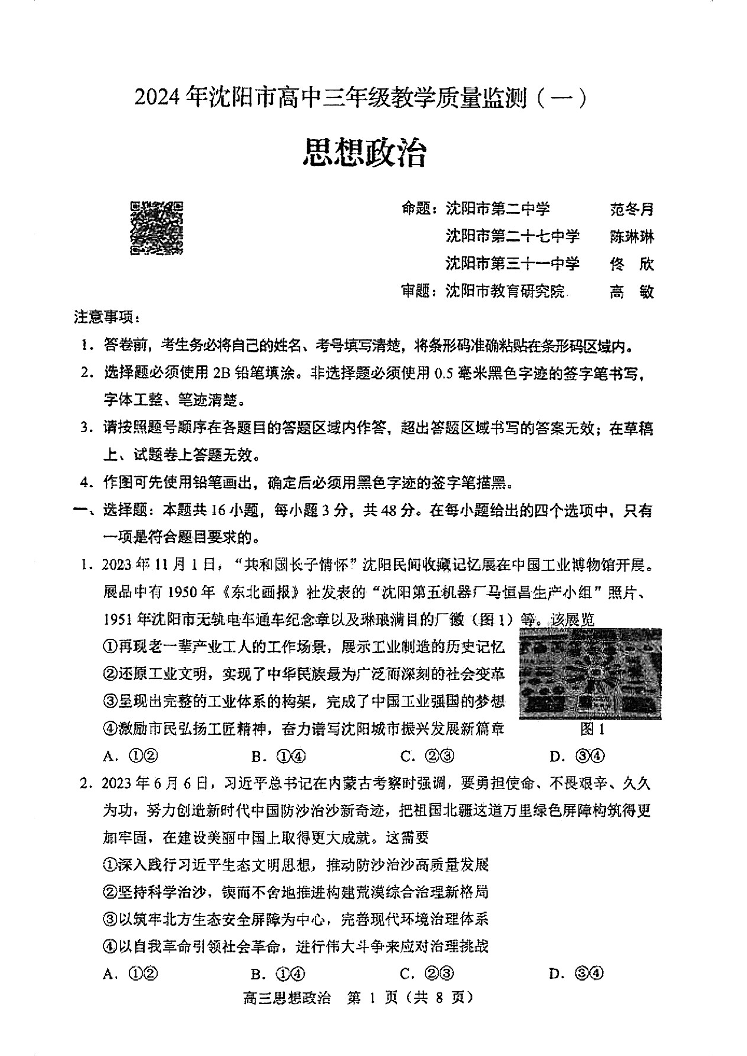 辽宁省沈阳市2023-2024学年高三上学期教学质量监测(一)政治