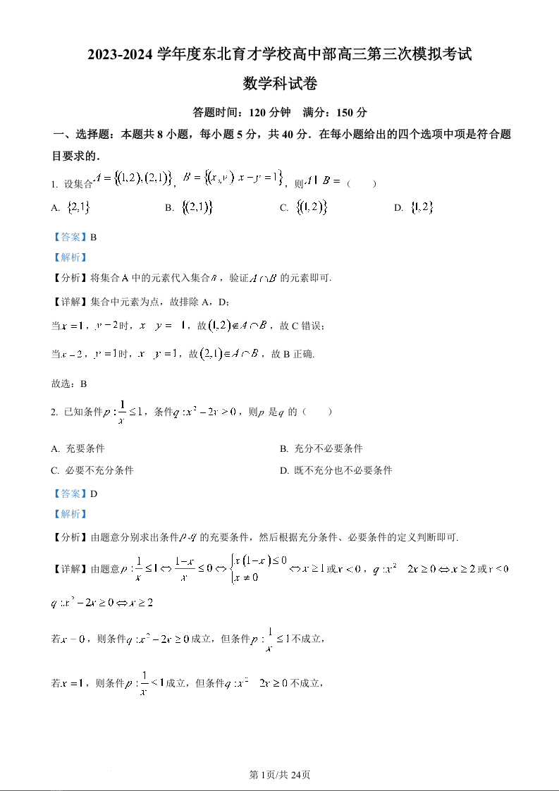 2023-2024学年度东北育才学校高中部高三第三次模拟考试 数学答案