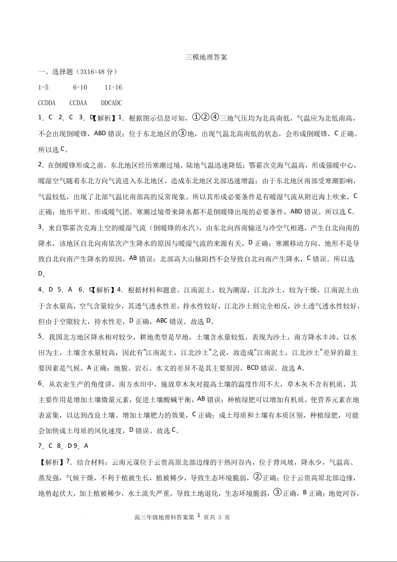 2023-2024学年度东北育才学校高中部高三第三次模拟考试 地理答案
