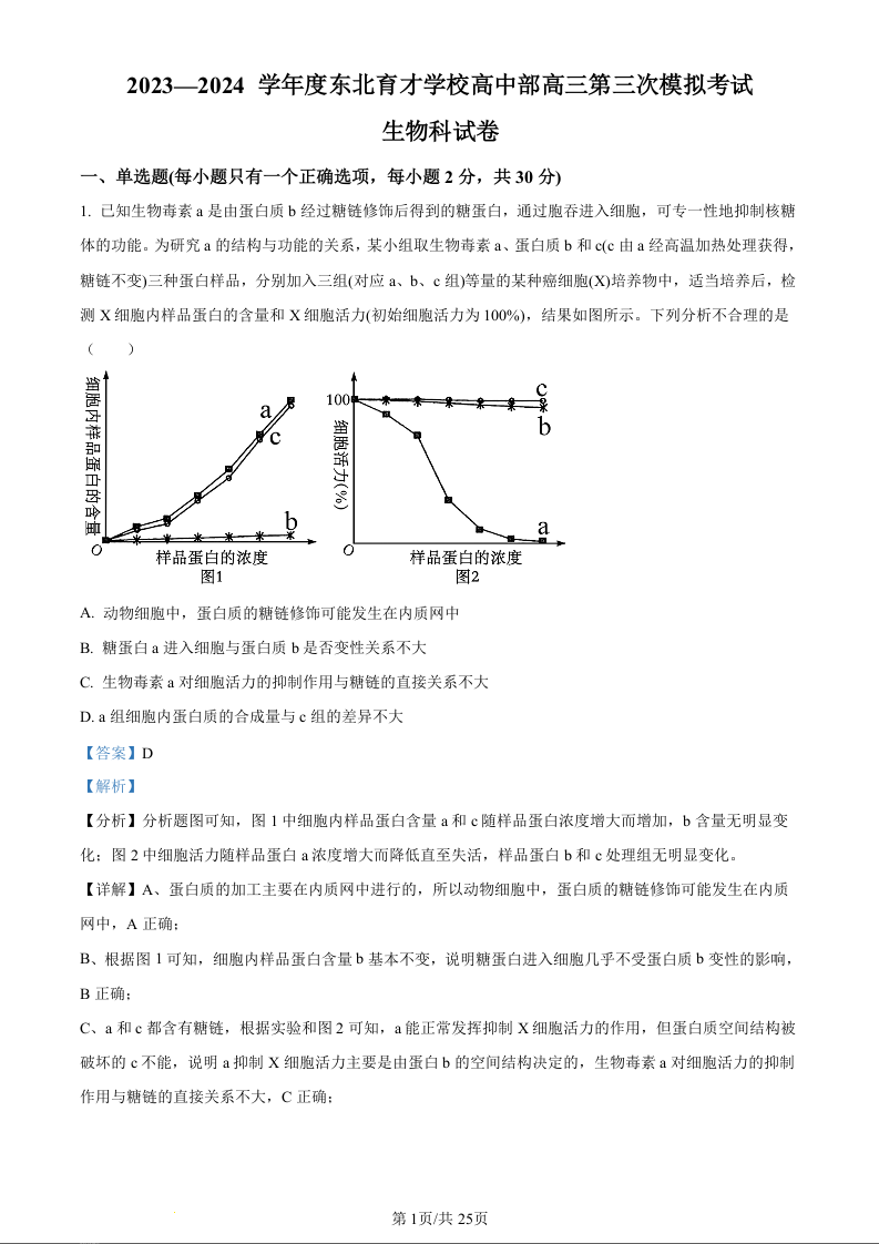 2023-2024学年度东北育才学校高中部高三第三次模拟考试 生物答案