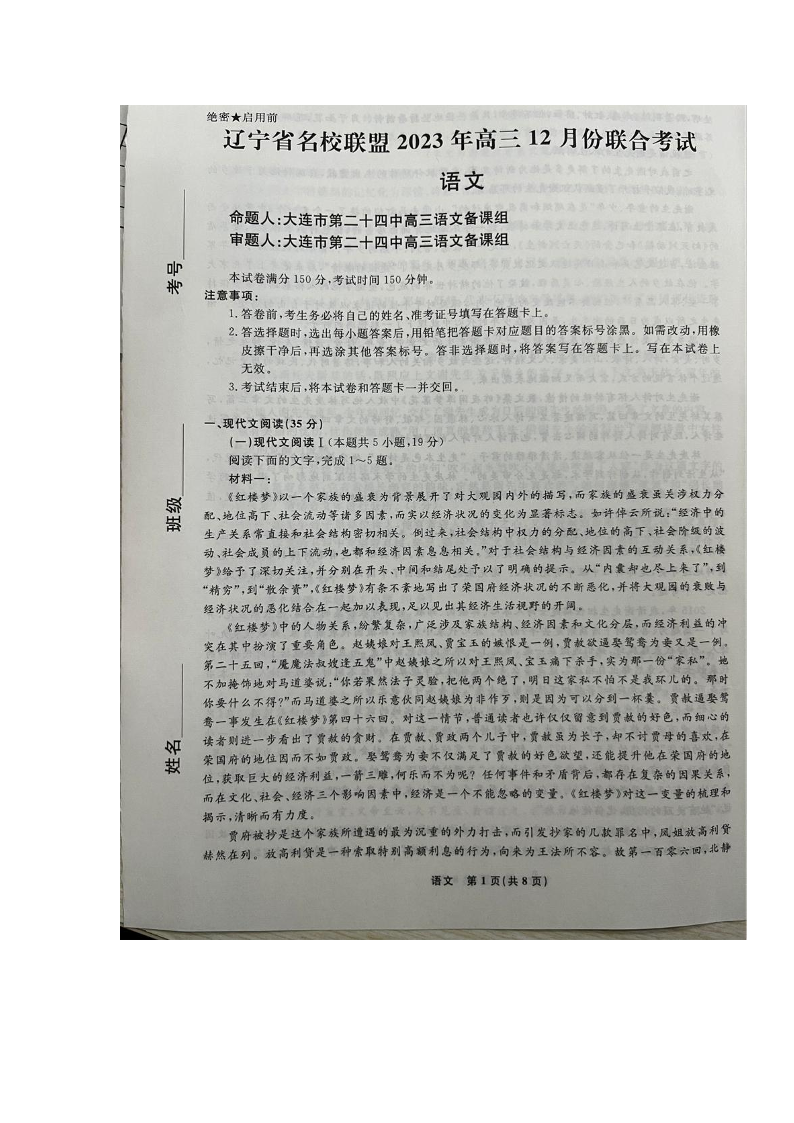 辽宁省名校联盟2023-2024学年高三上学期12月联合考试 语文