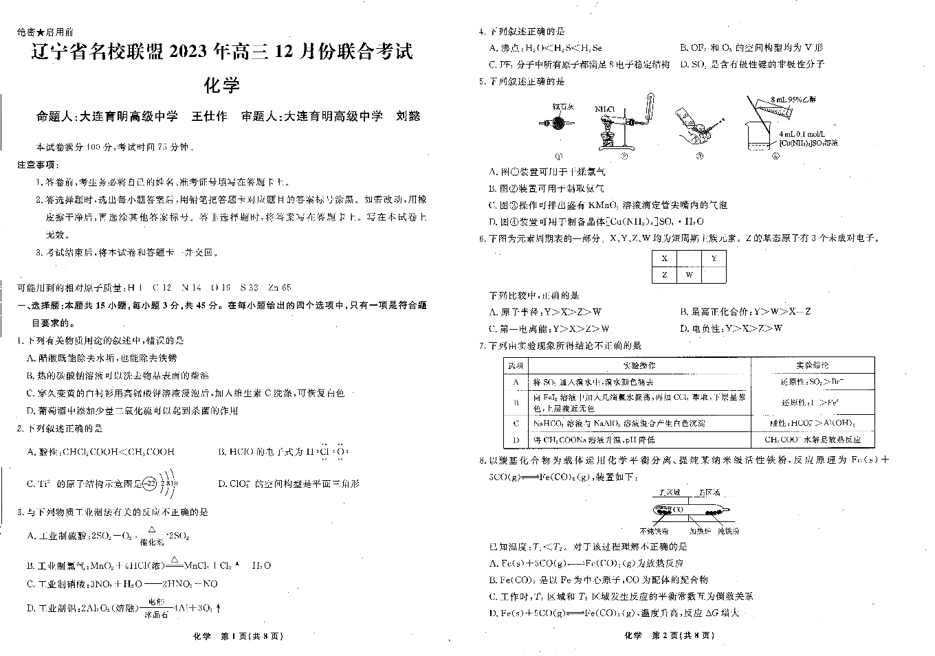 辽宁省名校联盟2023-2024学年高三上学期12月联合考试 化学