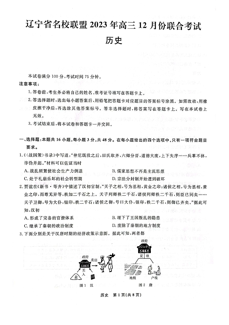 辽宁省名校联盟2023-2024学年高三上学期12月联合考试 历史
